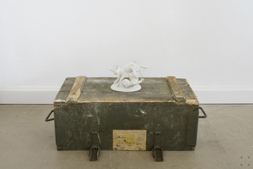 The Fall, 2013, Porzellanfigur auf Munitionskiste, 36 x 77 x 45 cm